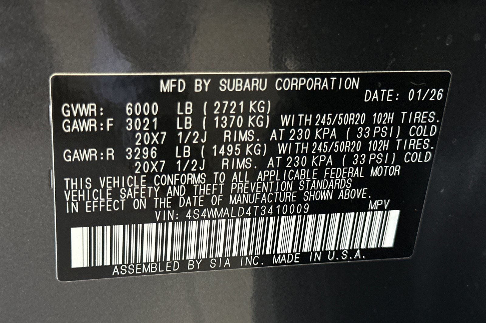 - Wheels: 20" x 7.5 J Black Finish Aluminum Alloy -inc: black wheel center cap w/Subaru 6 star logo