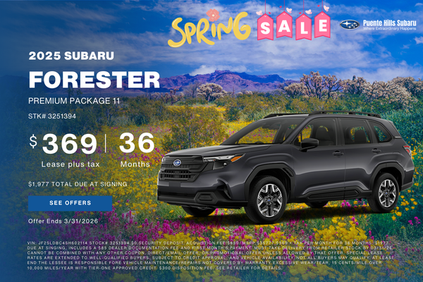 VIN: JF2SLDBC4SH602114 STOCK# 3251394 $0 SECURITY DEPOSIT. ACQUISTION FEE $650. MSRP $35777 $369 + TAX PER MONTH FOR 36 MONTHS. $1977 DUE AT SINGING. INCLUDES A $85 DEALER DOCUMENTATION FEE AND FIRST MONTH'S PAYMENT. MUST TAKE DELIVERY FROM RETAILER STOCK BY 03/31/26. CANNOT BE COMBINED WITH ANY OTHER COUPON, DIRECT/EMAIL OFFER, OR PROMOTIONAL OFFER UNLESS ALLOWED BY THAT OFFER. SPECIAL LEASE RATES ARE EXTENDED TO WELL-QUALIFIED BUYERS. SUBJECT TO CREDIT APPROVAL, AND VEHICLE AVAILABILITY. NOT ALL BUYERS MAY QUALIFY. AT LEASE END THE LESSEE IS RESPONSIBLE FORE VEHICLE MAINTENANCE/REPAIRS NOT COVERED BY WARRANTY EXCESSIVE WEAR/TEAR, 15 CENTS/MILE OVER 10,000 MILES/YEAR WITH TIER-ONE APPROVED CREDIT. $300 DISPOSITION FEE. SEE RETAILER FOR DETAILS.